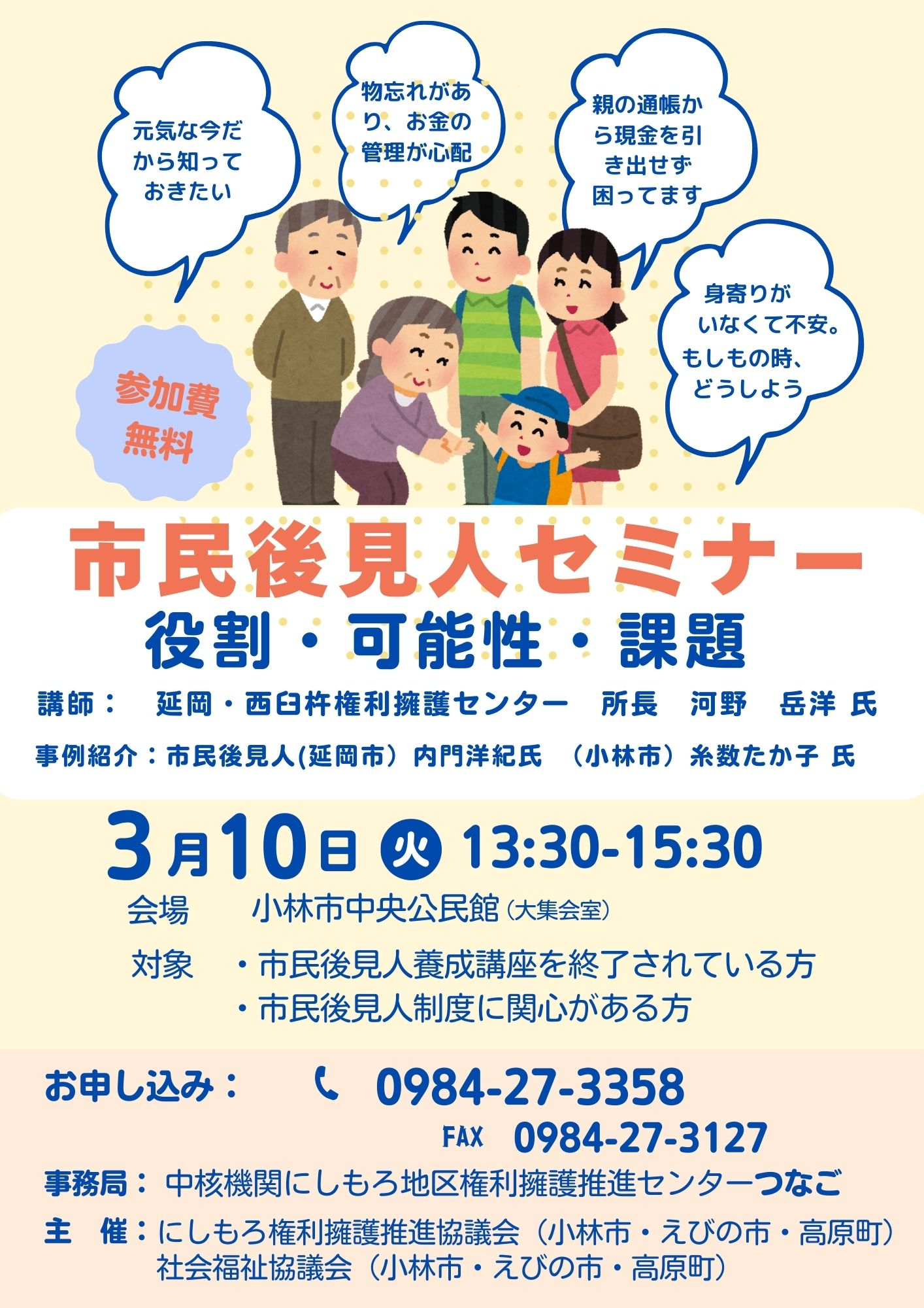 市民後見セミナーにご参加ください。 2026年1月20日 最終更新日時 : 2026年1月20日 editor@tunago 市民後見セミナーを開催いたします。参加ご希望の方は、事務局までお問い合わせください。 記1 日時:令和8年3月10日(火)13:30~15:302 場所:小林市中央公民館(大集会室)3 講師:延岡・西臼杵権利擁護センター 所長 河野岳洋氏4 テーマ:役割・可能性・課題5 申込み・問い合わせ 【0984-27-3358】